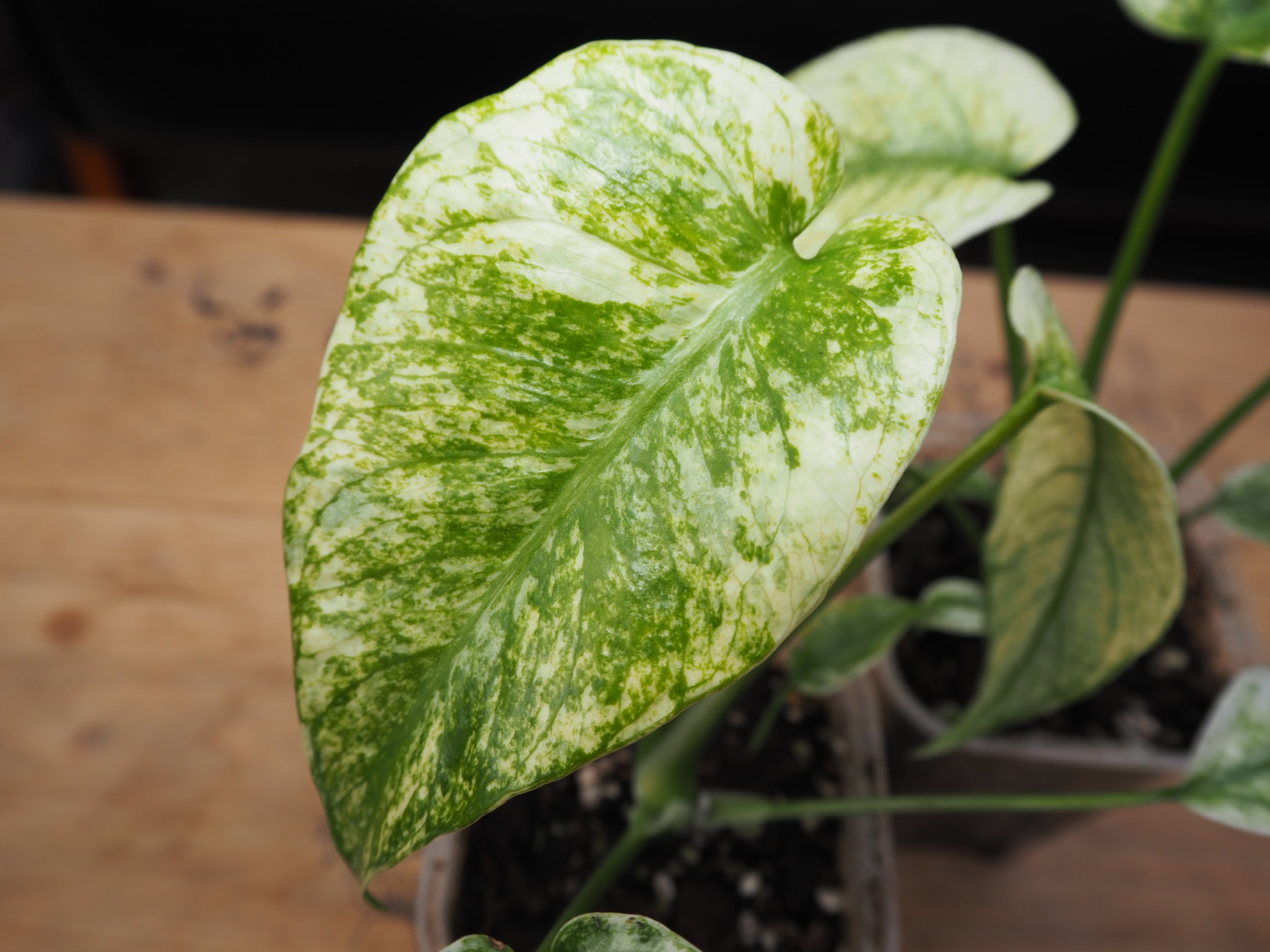 深緑の葉に雪のような白やクリーム色の斑が大胆に入る、非常に希少で高価なデリシオーサの斑入り品種です。新葉は白く、成長とともに緑が増す後斑(あとかふ)が特徴。耐陰性があり室内で管理しやすいが、美しい白斑を保つには適度な光と通気性が必要