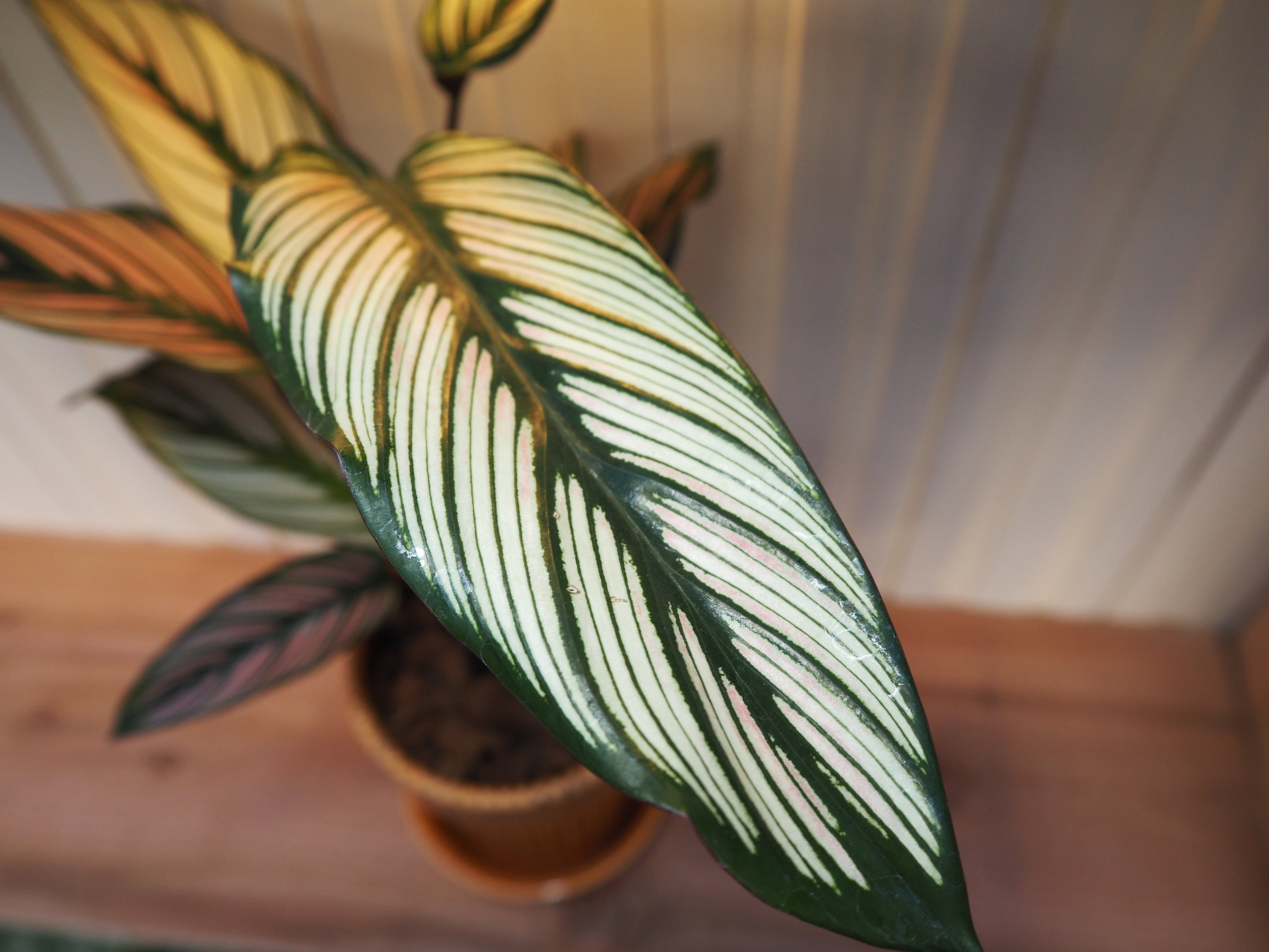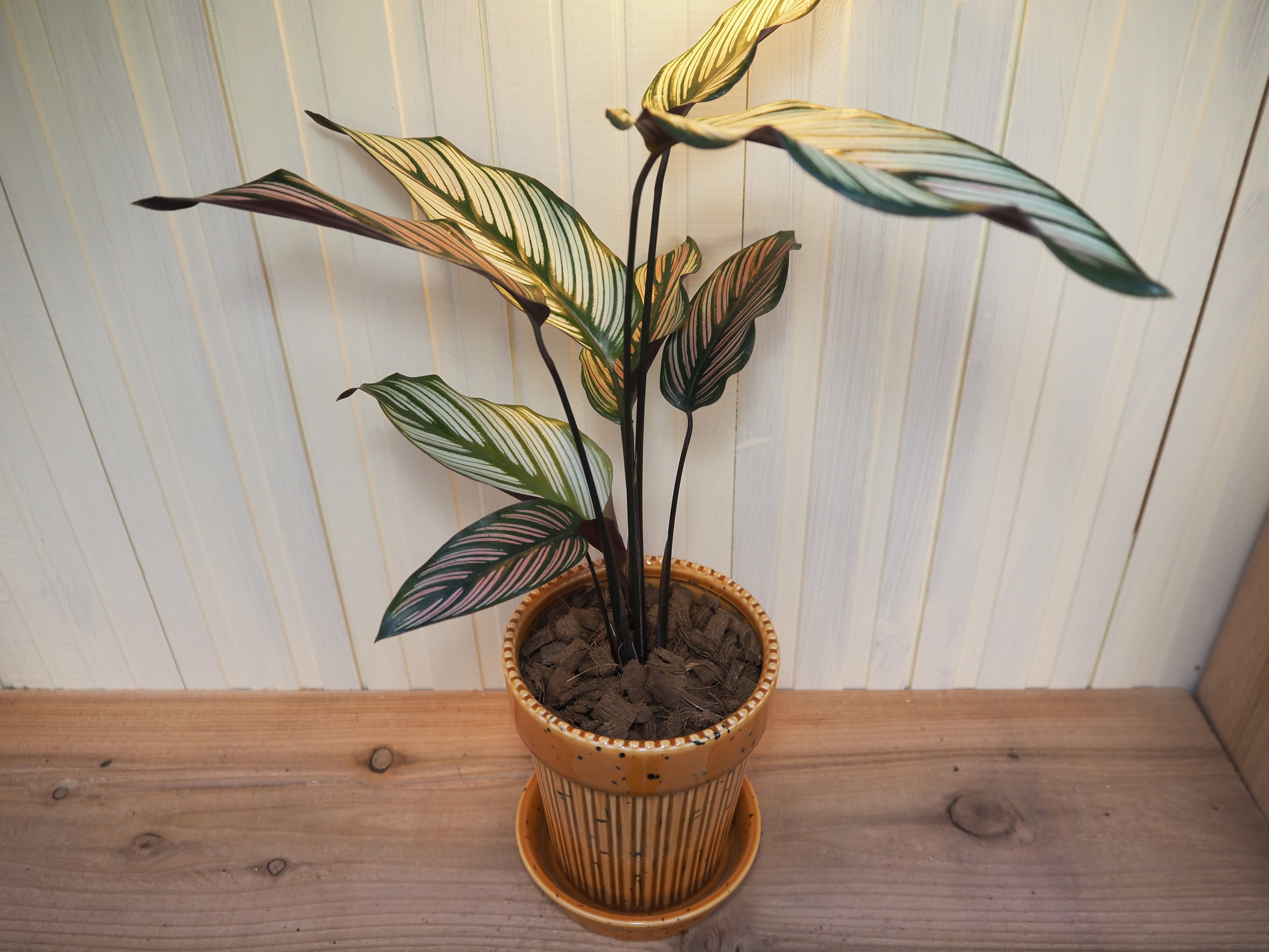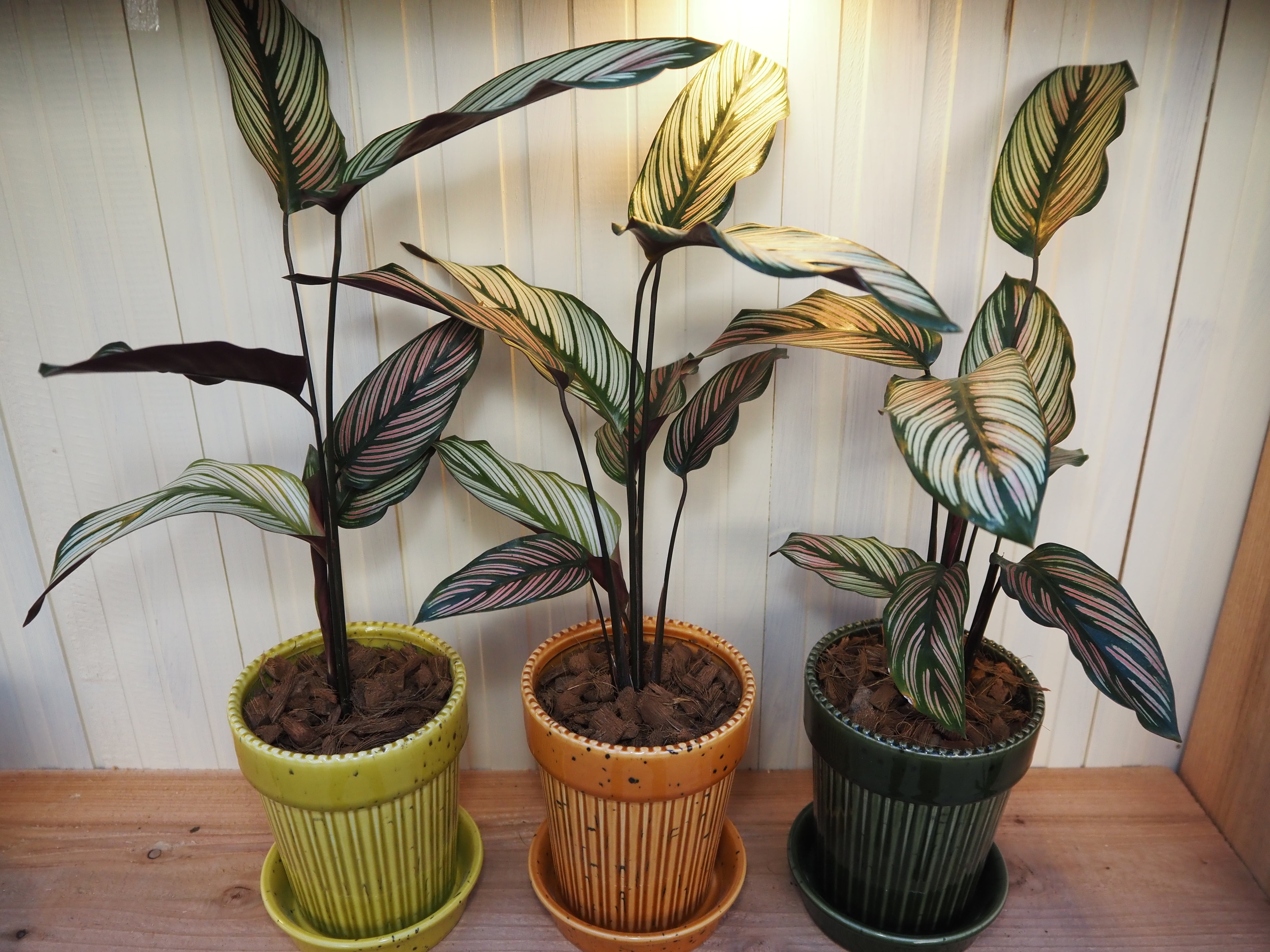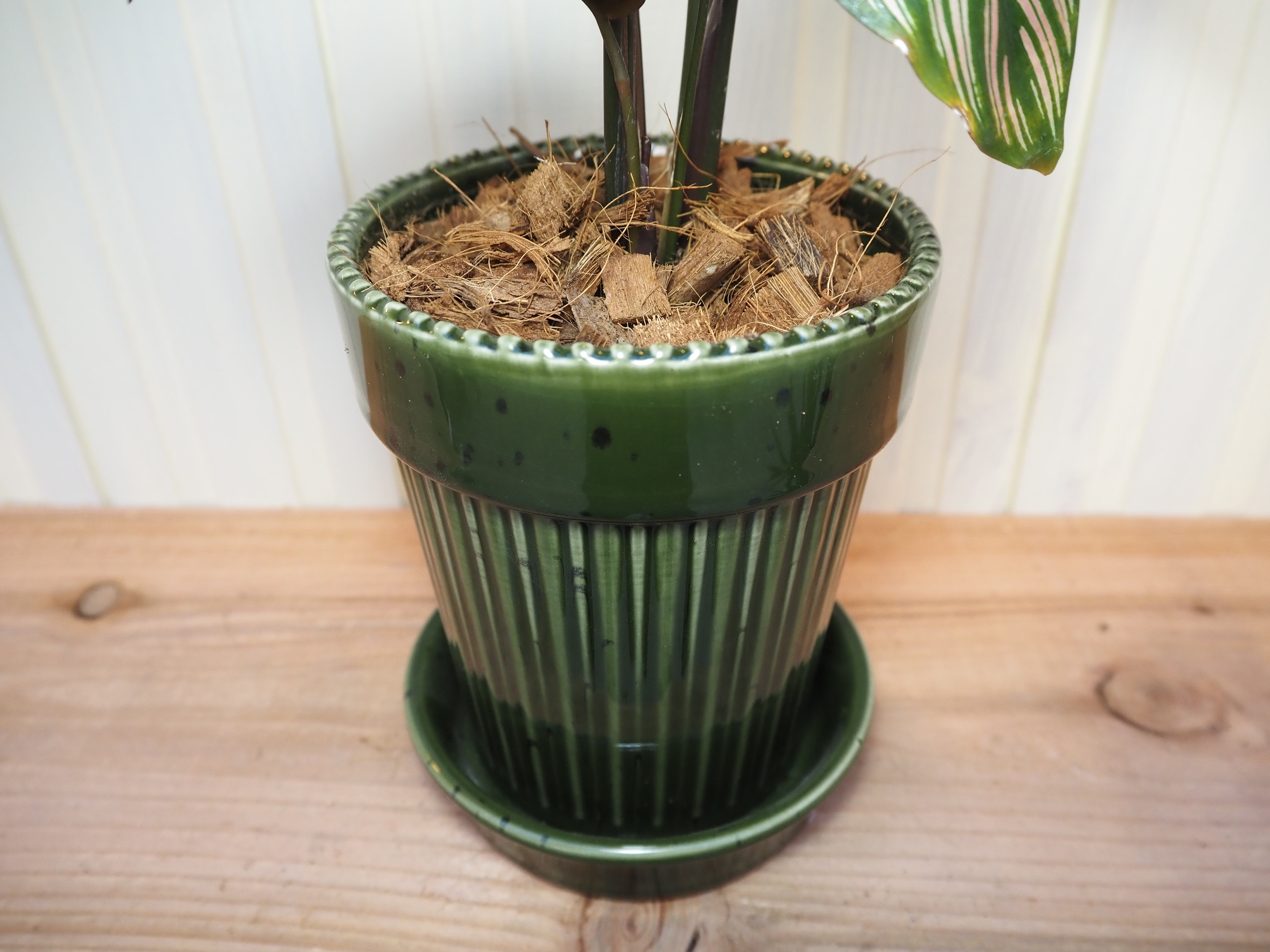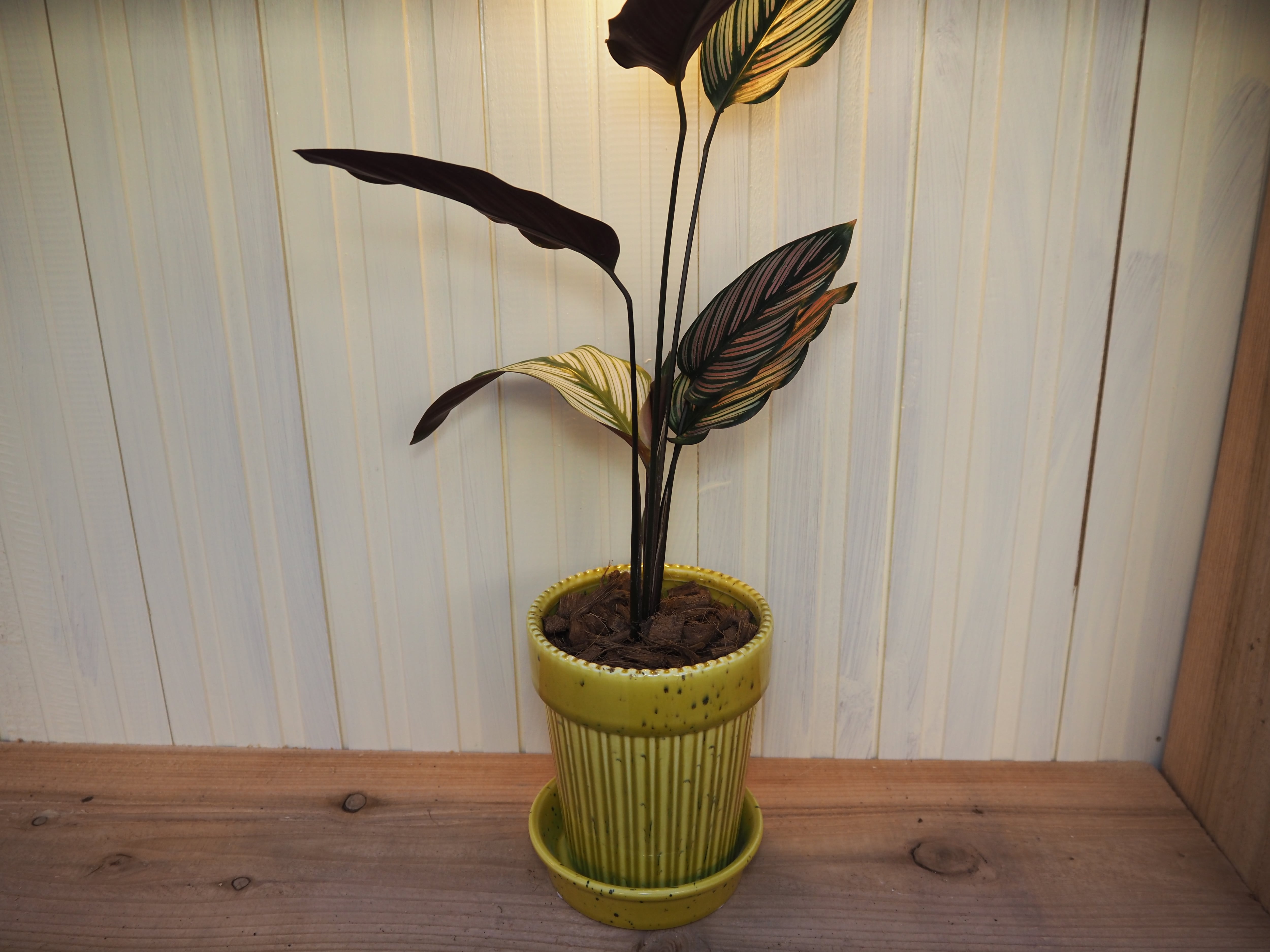 カラテア ホワイトスターをコップ鉢に直接植え込んでいるセットです。3色展開