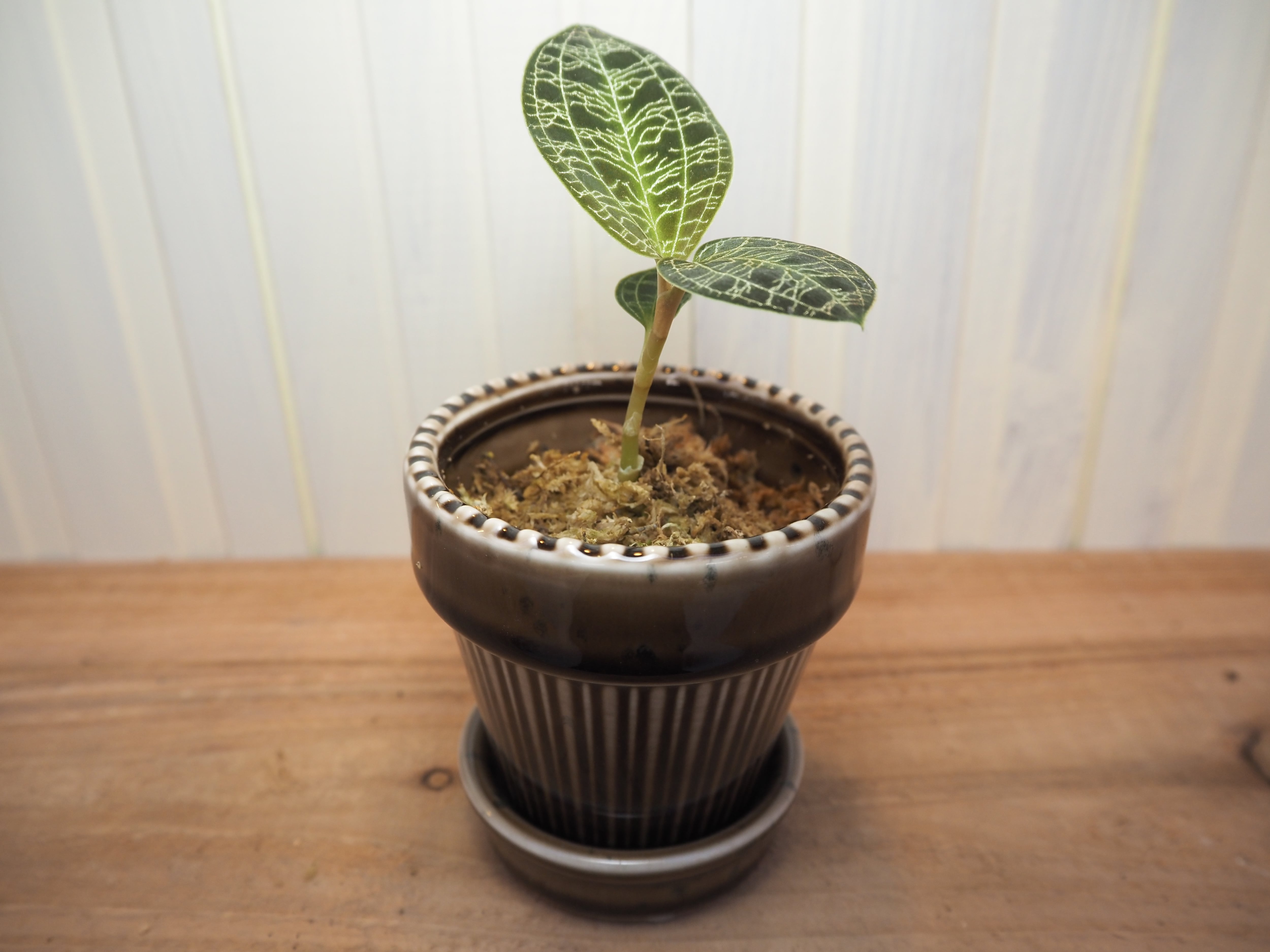 ジュエルオーキッド マコデスを茶色のかわいいミニコップ鉢に直接植え込んでいるセットです。