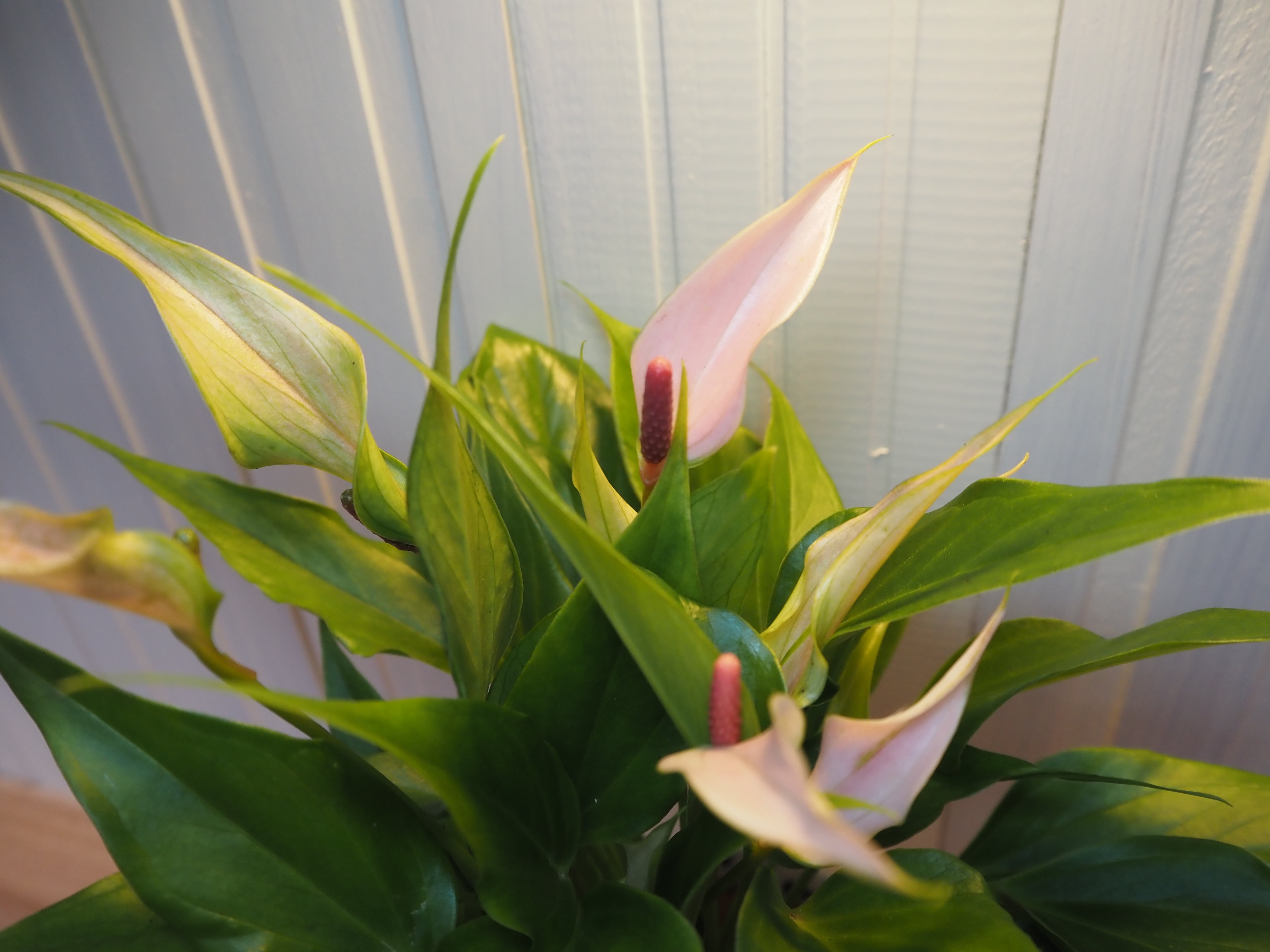 アンスリウム リリィは小ぶりで可愛らしいピンク色の花(仏炎苞)を次々と咲かせる、アンスリウムの仲間です。一般的なアンスリウムよりも葉や花が細身で、シュッとしたスタイリッシュな雰囲気が特徴的。