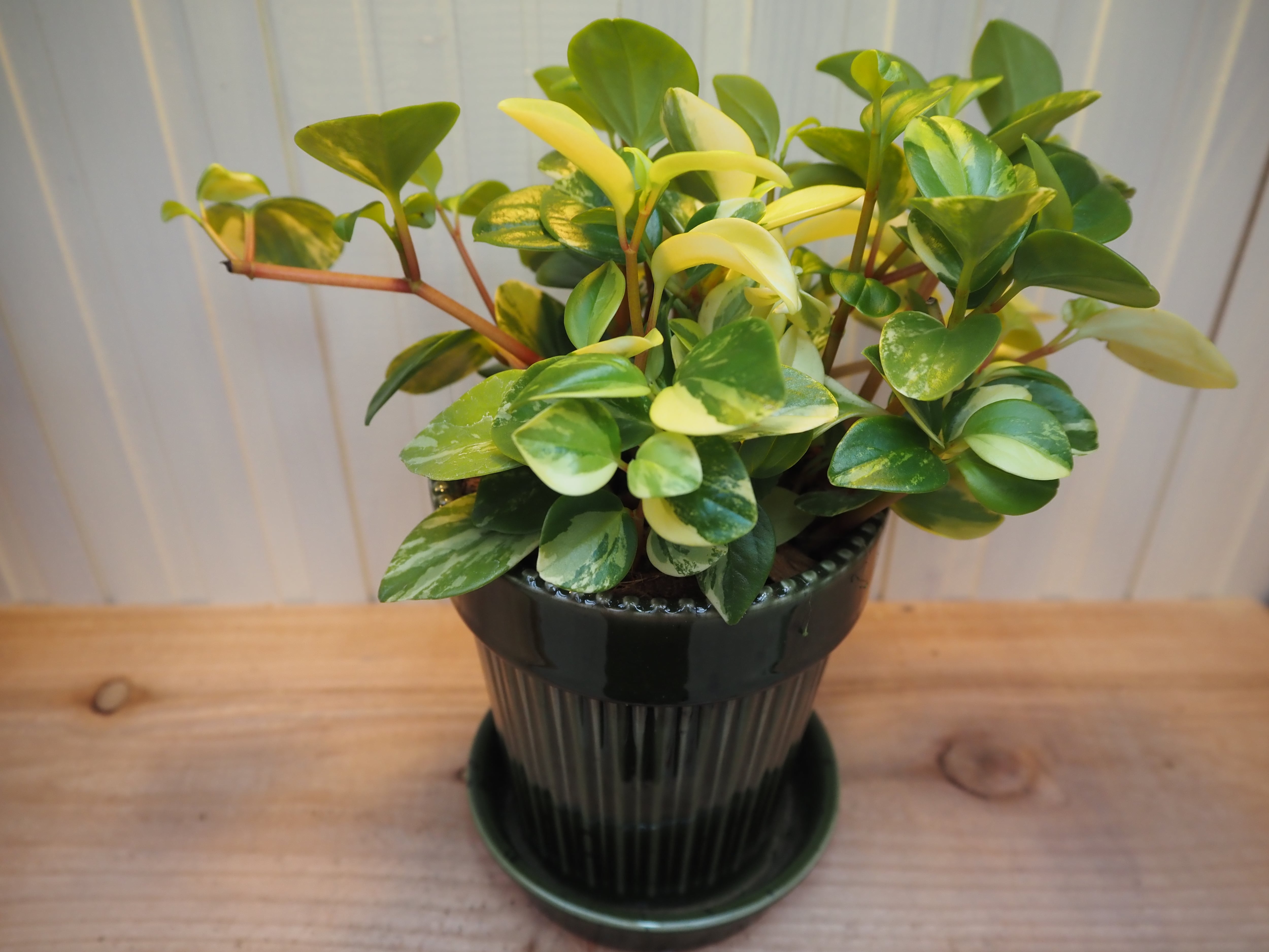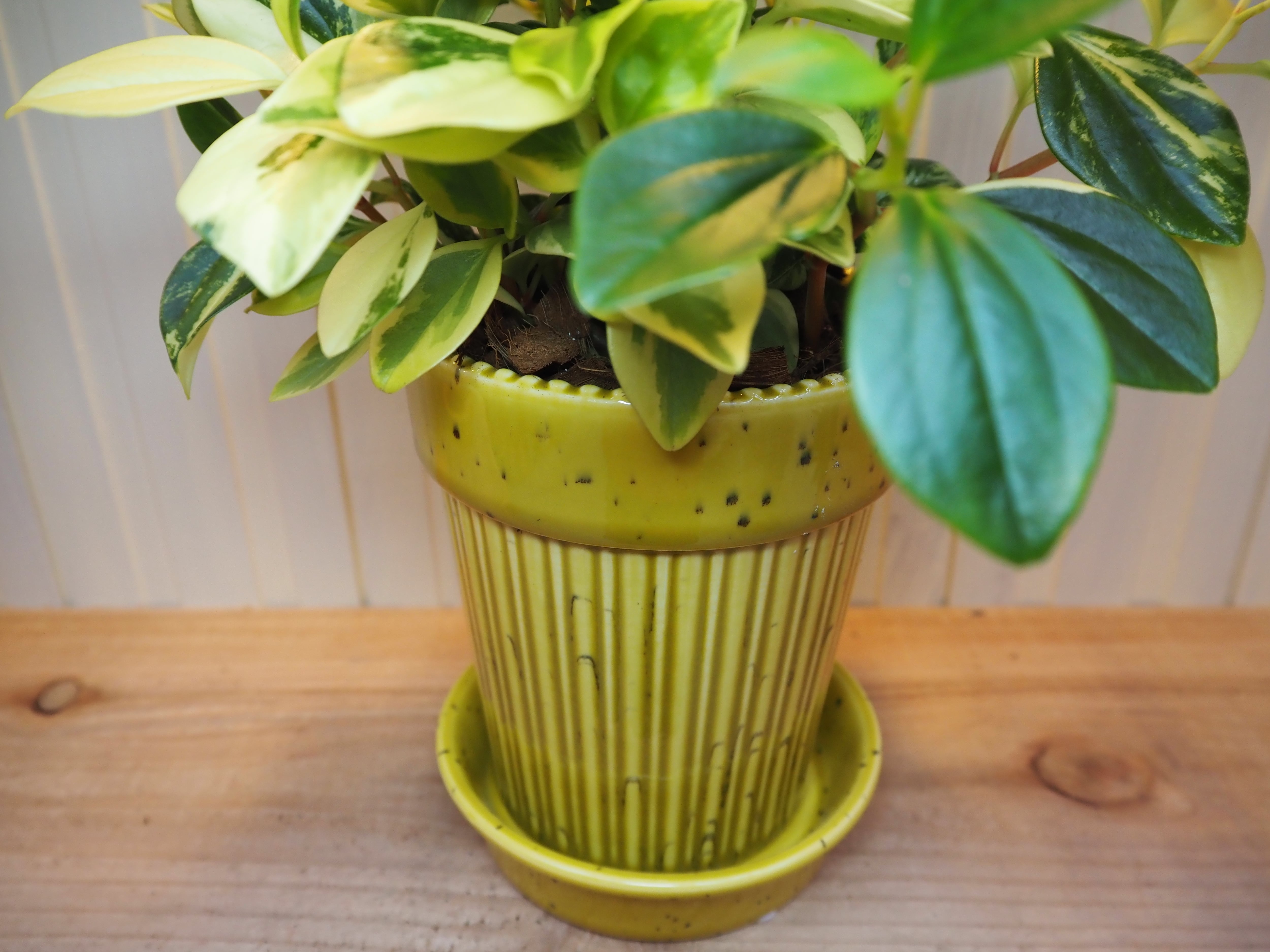 ペペロミアのグラベラをポップなコップ鉢に直接植え込んでいるセットです。
