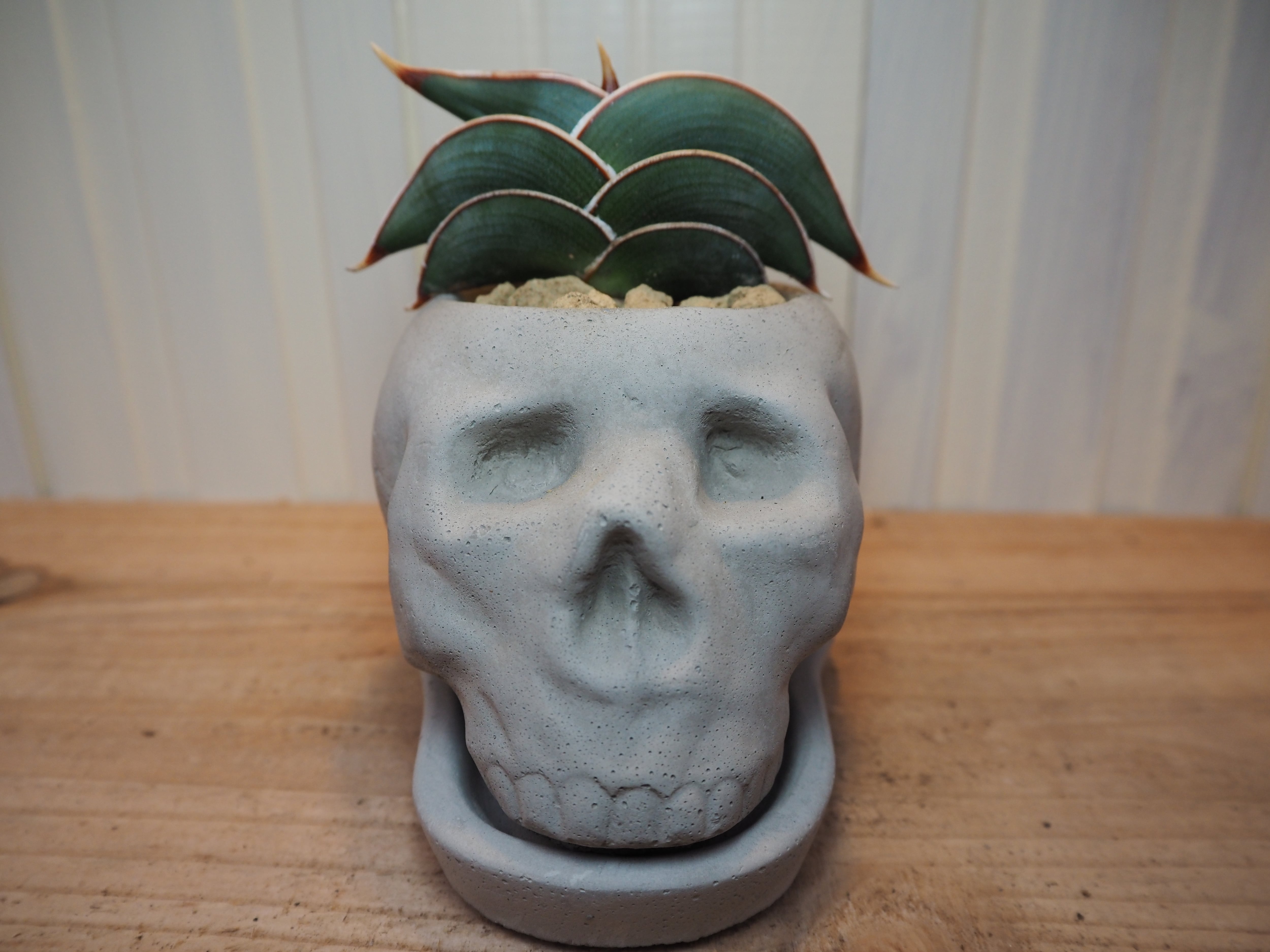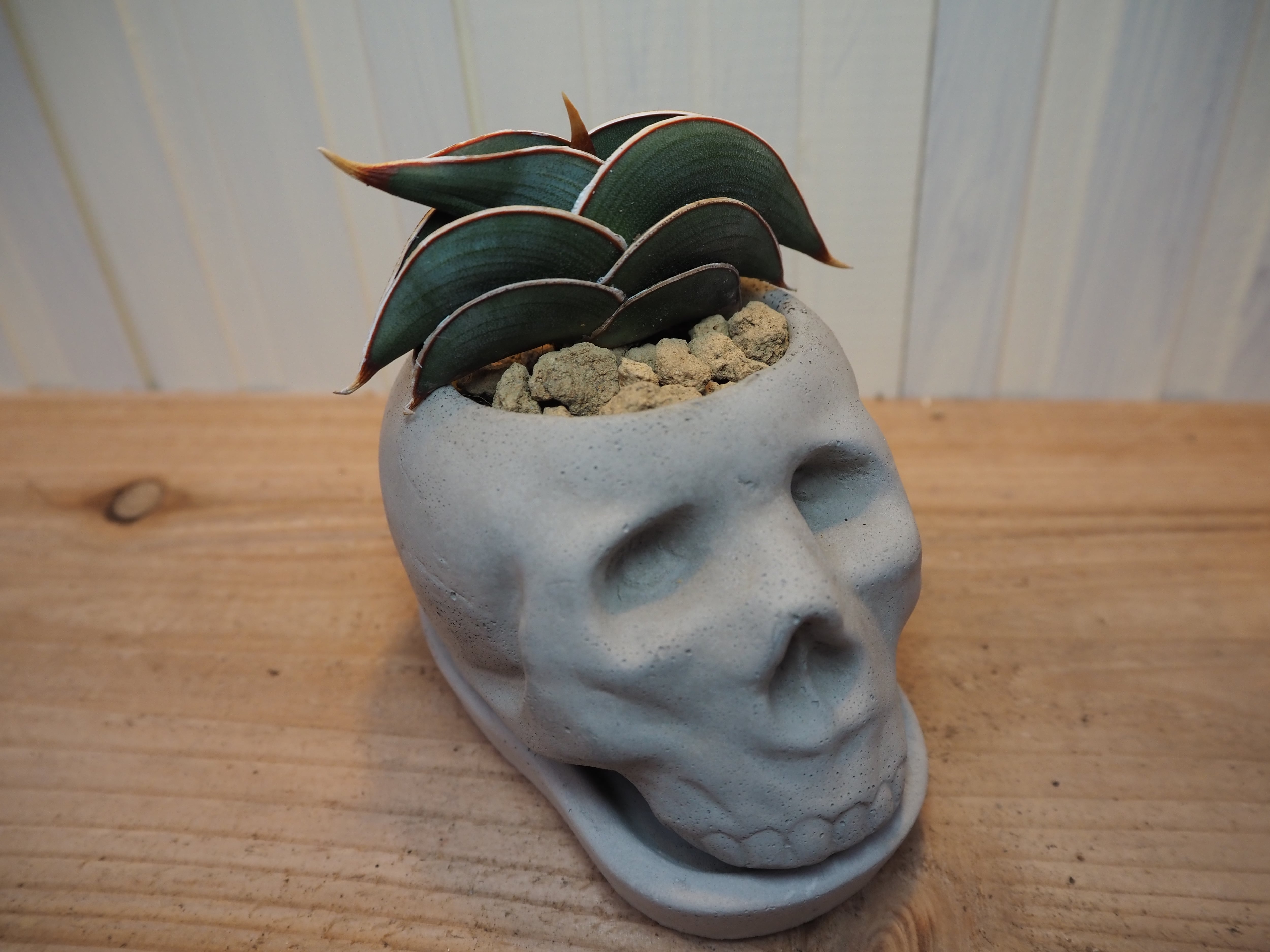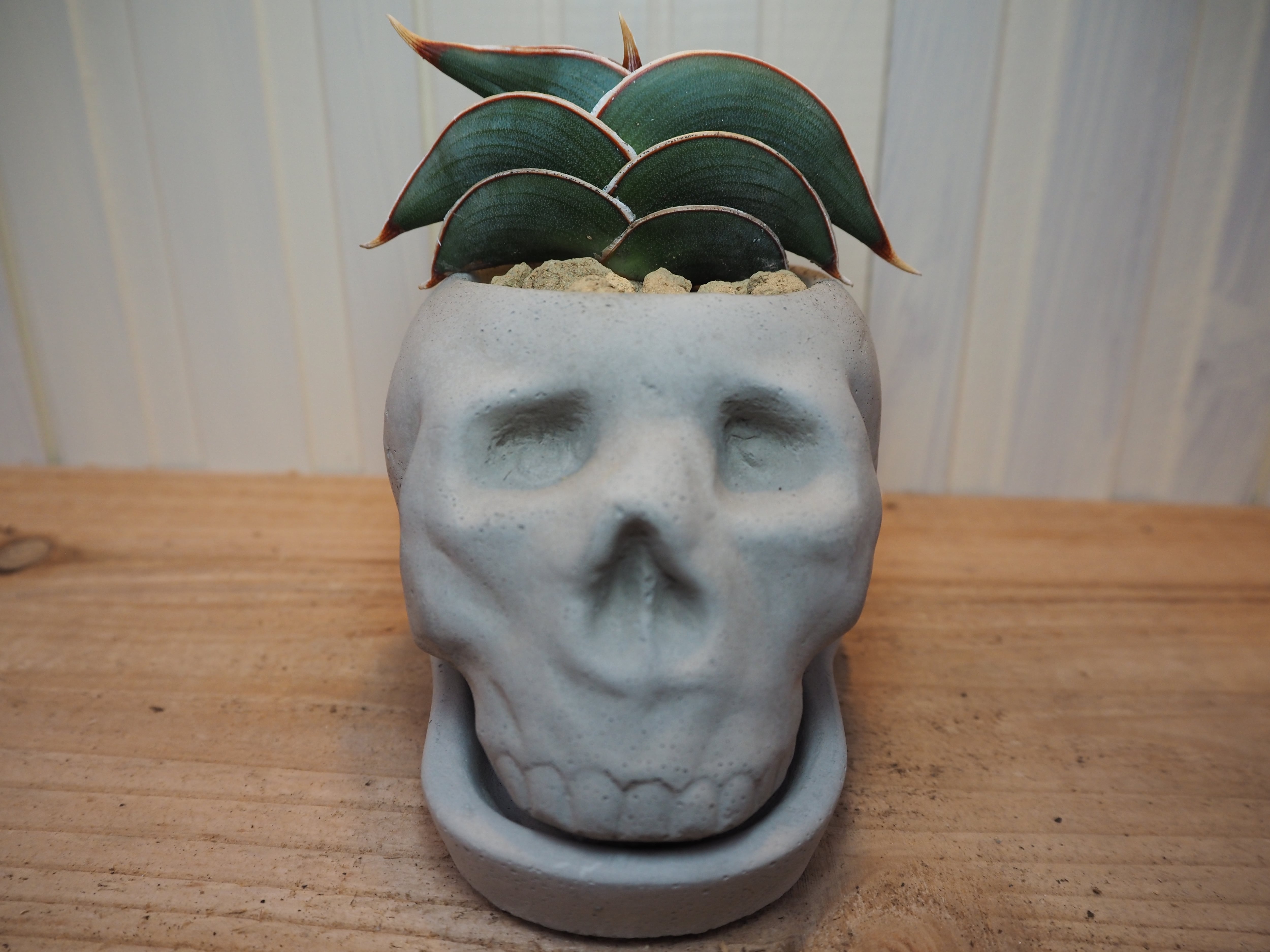 サンセベリア ロリダを骸骨の鉢に直接植え込んだセット商品です。クールな雰囲気に仕上がりました。