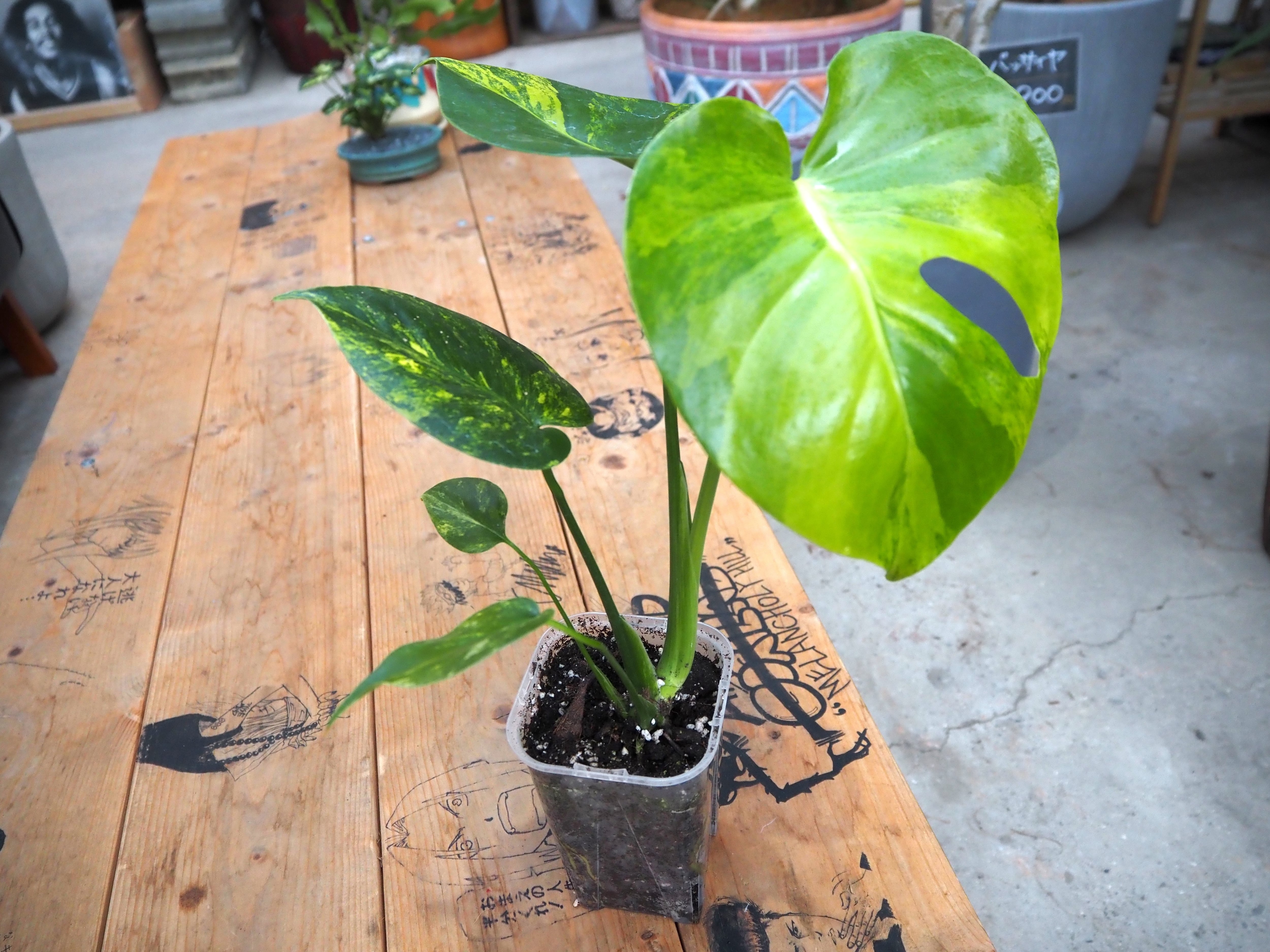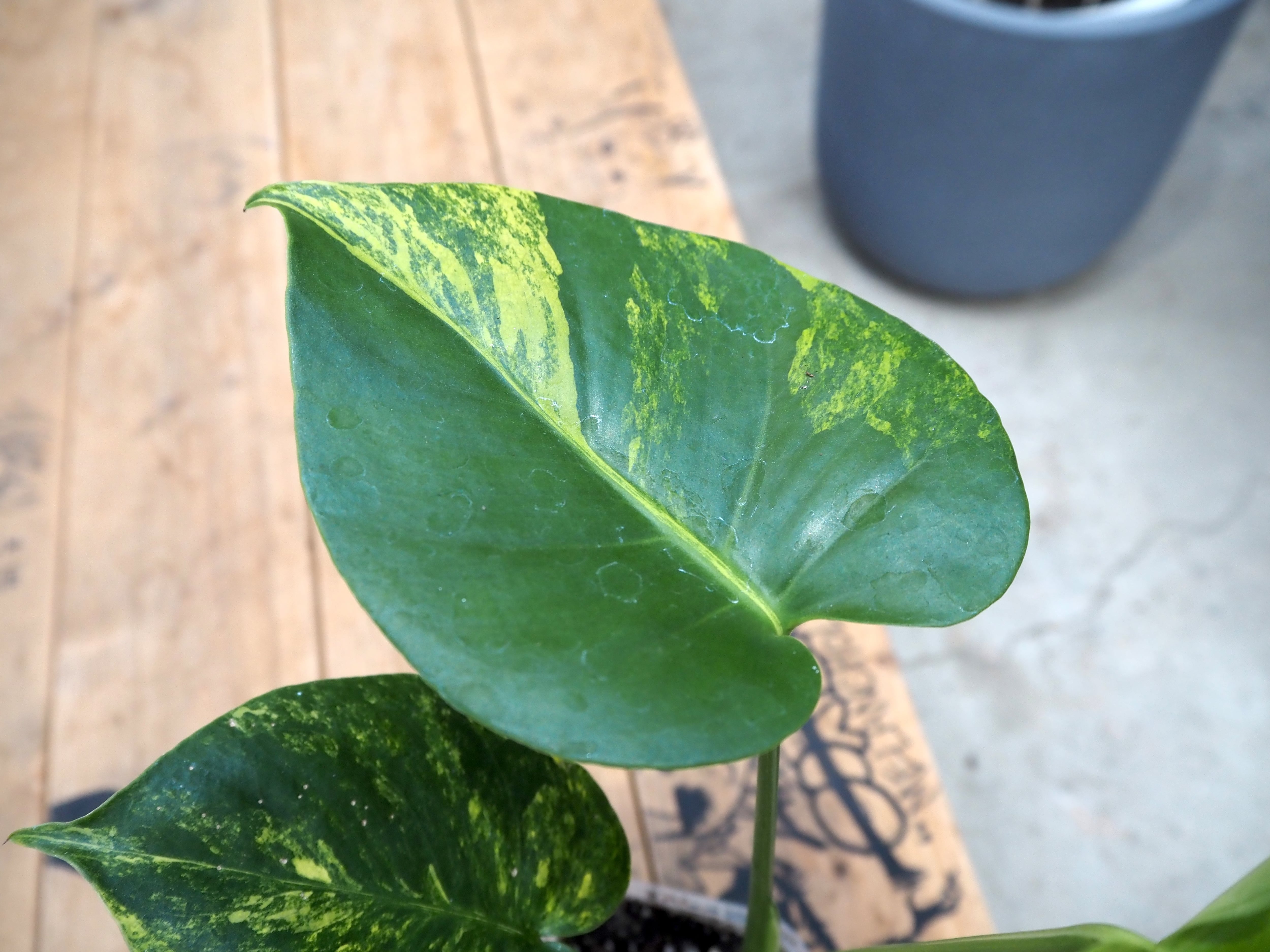 光を反射して輝くような黄斑の葉は、一鉢置くだけで空間をパッと明るく、ラグジュアリーな雰囲気に変えてくれます。大型化するにつれ、切れ込みと斑のコントラストはさらに迫力を増していきます。