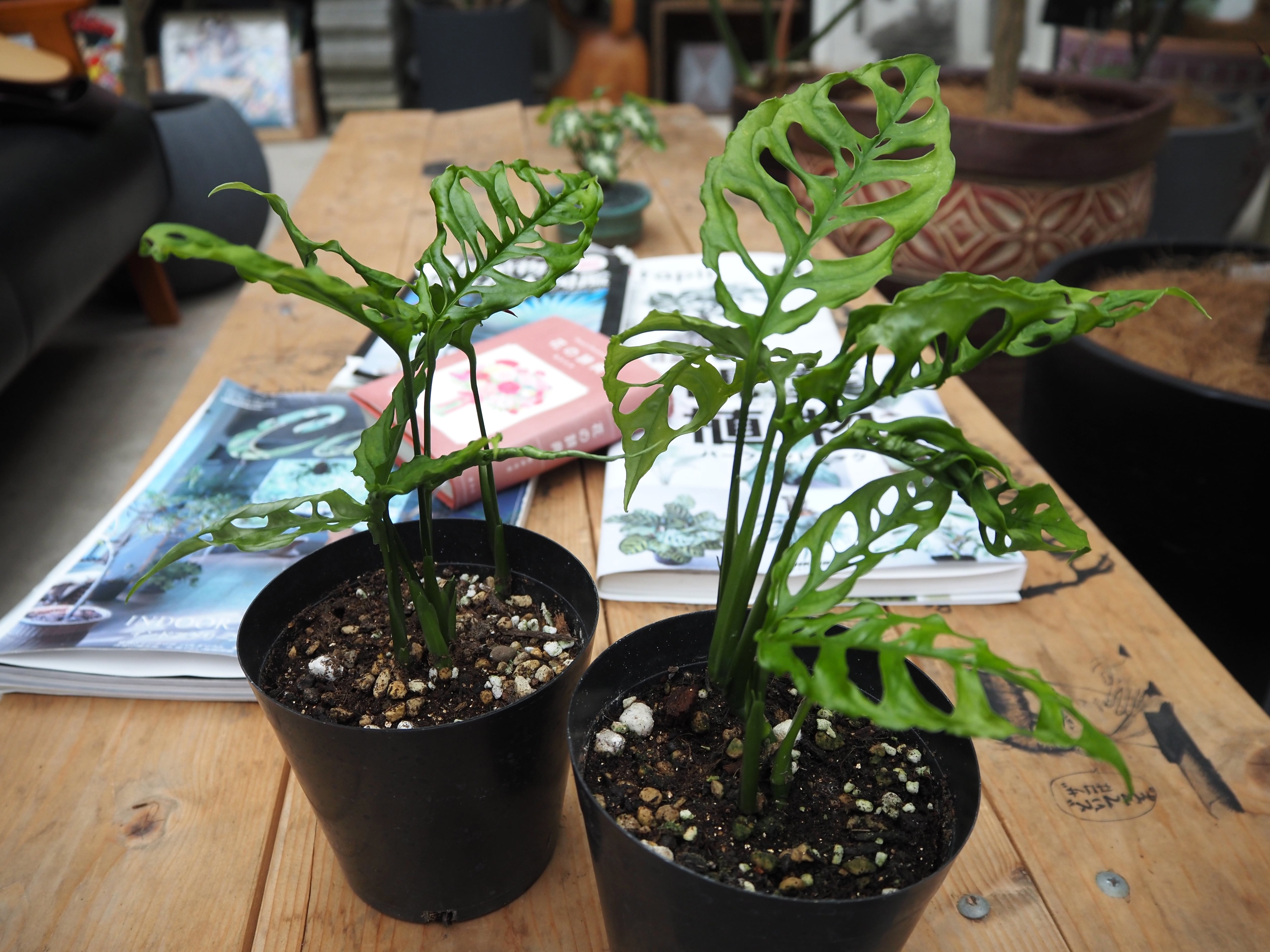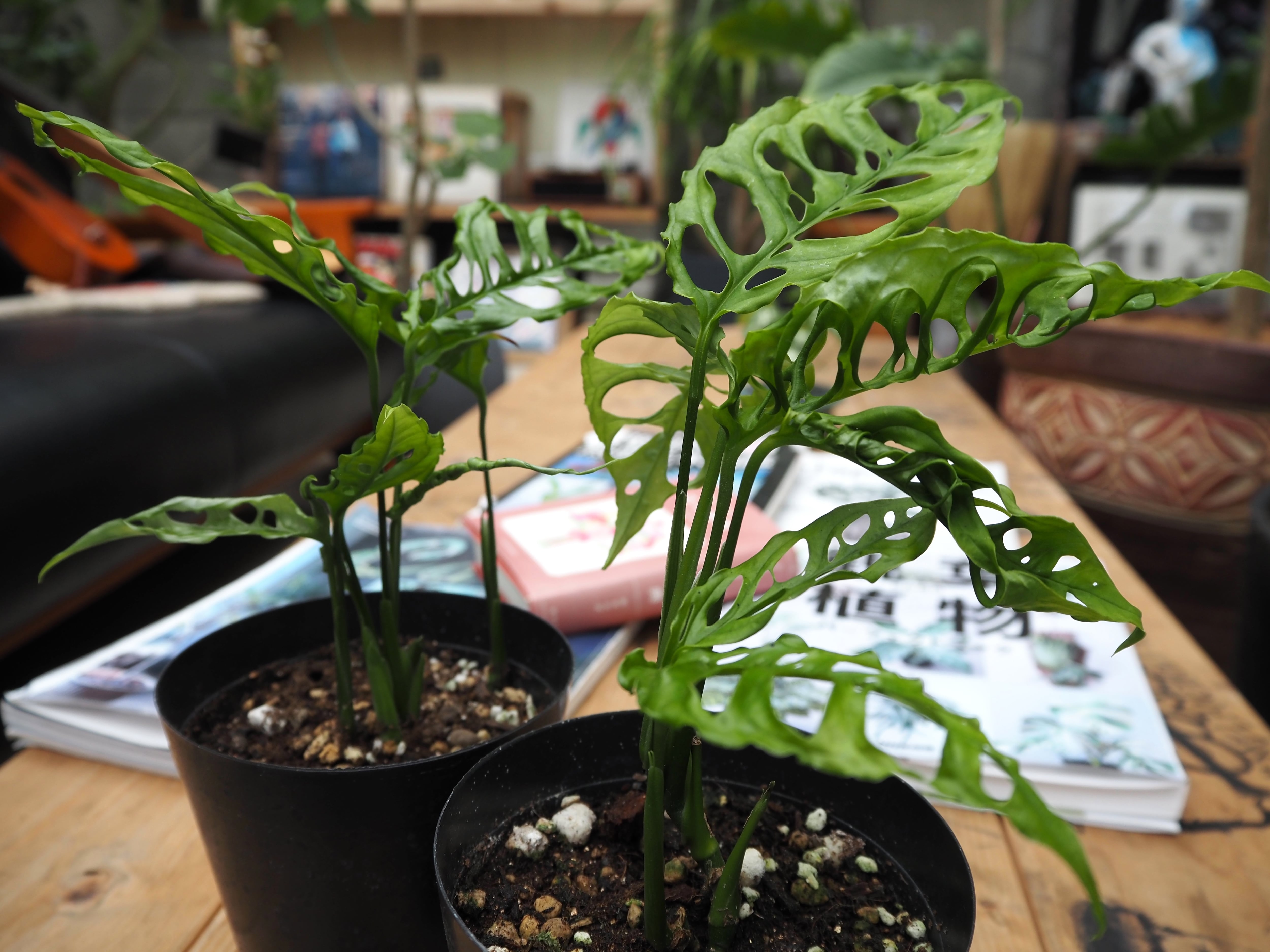 一般的なマドカズラ(モンステラ アダンソニー)とは異なり、流通量はごくわずか。野生でも滅多に見ることができない「生ける宝石」です。紙のように薄く繊細な葉が描くシルエットは、唯一無二の存在感を放ちます。マドカズラに比べて穴が大きく葉っぱが波打った様相はとても芸術的です。